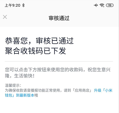 2020年2月20日 09点30分:早上发现付款码已经审批通过了!新增码牌申请方法。更多讨论欢迎加入TG群租 或者 进官方QQ群!评论区有一个直接网页申请的地址!没有小米手机的可以试一试(不知是否可行)。